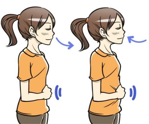 □お腹を凹ませながら風船を膨らますように細く長い息を吐きます
